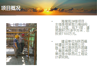 为了贯彻落实公司内涵建设有关精神,丰富公司教师的社会实践经验,提高教师的业务能力及教学水平,造就一支 “双师型”教师队伍,建筑公司统一联系校企合作单位作为专业教师锻炼的企业。2014年7月20日-8月20日,许方伟、刘敏2位老师在建筑公司的统一安排下,前往陕西方圆建工集团有限公司海棠苑项目部进行实践锻炼。海棠苑项目项目建设单位为陕西福林建设开发有限公司,施工单位是陕西方圆建工集团有限公司,设计单位是中联西北工程设计研究院。主楼是框架剪力墙结构地上32层,地下1层,建筑面积3万多平方米。