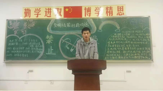 活动开始前由各班纪律委员强调会场纪律,主持人宣读本次班会注意事项并宣布班会正式开始。首先由主持人为我们简单介绍吸烟的危害,在全世界每年有500万人因为吸烟而死亡,同时也介绍了我国吸烟人数以及青少年吸烟人数占全国吸烟人数的百分之三十六左右。接着由测量1801班王浩同学就我国吸烟问题进行演讲,我国吸烟人数占全世界的吸烟人数的百分之二十五,我国现在大概有三亿两千万烟民,其中十五岁以上的就占总人数的百分之三十七点多,如果不进行制止,将会给社会文明和人民身体健康带来不可挽回的结果。