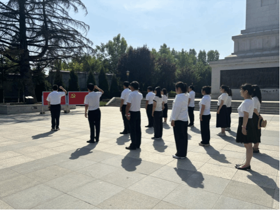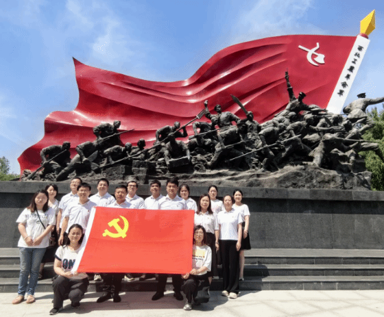 首先,在讲解员的带领下,全体党员怀着崇敬的心情绕行烈士纪念碑一周,并向纪念碑行三鞠躬礼,在巍峨肃穆的纪念碑前,全体党员面对鲜红的党旗庄严宣誓,重温入党誓词,如图2所示。