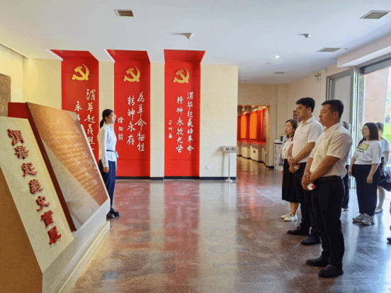 随后,在讲解员的带领和讲解下,先后参观了渭华起义陈列大厅、渭华起义指挥部旧址等。大家驻足在由青砖铺就的“同志们,赶快踏着先烈的鲜血前进啊”巨幅标语前深受震撼,通过听取讲解、观看实物、参观历史资料和图片的方式,详细了解渭华起义的历程,共同追忆那了段血与火的峥嵘岁月,深切感悟革命烈士悲壮英勇的动人事迹,如图3所示。
