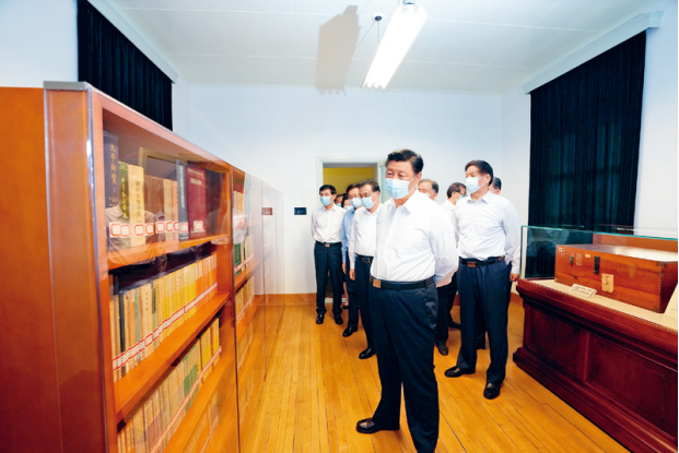 2021年6月25日,中共中央政治局就用好红色资源、赓续红色血脉举行第三十一次集体学习。这次集体学习采取参观和讨论相结合的形式,这是习近平、李克强、栗战书、汪洋、王沪宁、赵乐际、韩正等在北大红楼参观“光辉伟业 红色序章——北大红楼与中国共产党早期北京革命活动主题展”。 新华社记者 谢环驰 摄