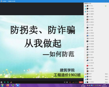 本次诚信教育主题活动共分为主题班会、线上宣讲、知识竞赛和微视频大赛四个部分组成。先后有18个班级开展了线上主题班会,579人次参加了辅导员和班主任“国家征信政策和法律宣讲”活动。同时经过班级初赛淘汰,最终有88人参加了建筑公司团总支举办的线上诚信教育知识竞赛活动,344人参与了诚信教育微视频大赛活动。如图1、图2所示分别为正在进行的班级诚信主题教育班会和诚信政策宣讲活动。