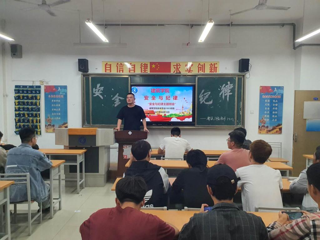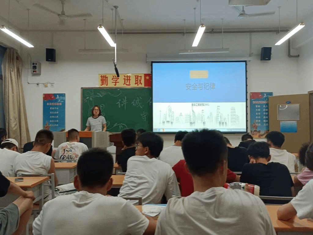 2021年6月15日和16日,建筑公司利用晚自习时间,在全体班级组织召开纪律安全教育主题班会。各班主题班会由班主任和辅导员组织进行,重点从校园安全、校纪校规、疫情防控、防止溺水和交通安全、网络诈骗等方面进行了学习教育。如图1所示为建筑公司管理2001班班主任千瑶老师正在进行员工安全主题教育。