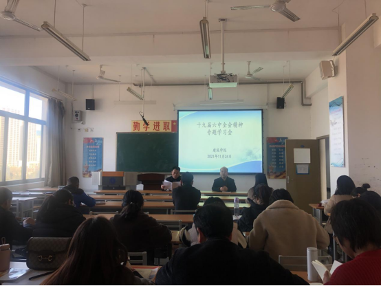 党总支书记邢剑宏要求全体教职工迅速掀起学习热潮,坚持领导带头学、全体全员学、系统全面学,把学习党的十九届六中全会精神与工作实际结合起来,深刻领悟《决议》和习近平总书记重要讲话的丰富内涵、精神实质和重大要求,做到学深悟透、融会贯通。