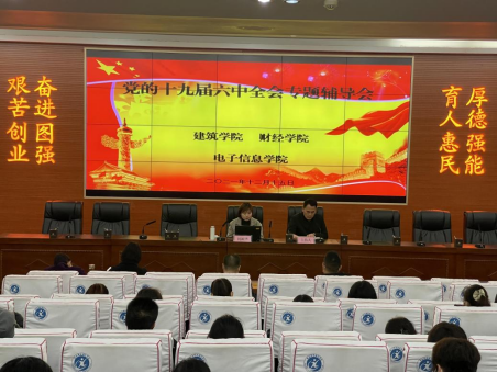 为深入学习贯彻党的十九届六中全会精神,进一步准确理解和把握全会精神,切实把思想和行动统一到全会精神上来,12月15日下午,公司宣讲团成员马克思主义公司杨颖华老师就学习贯彻全会精神作专题辅导报告。建筑公司、电子信息公司、财经公司全体教职工参加报告会,会议由建筑公司党总支书记邢剑宏主持。