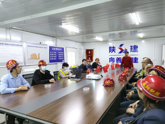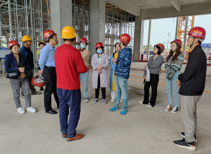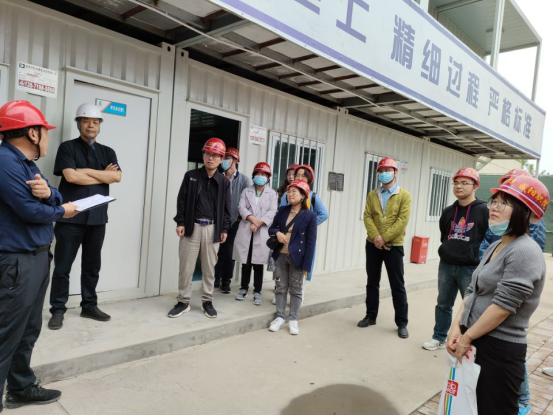 在机电产教融合综合实训楼项目,基建处副处长陶剑峰首先介绍了公司二期建设总体规划,李工详细介绍了项目概况。随后陶剑峰对该项目一些新材料、新技术、新工艺应用进行了现场介绍。